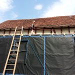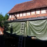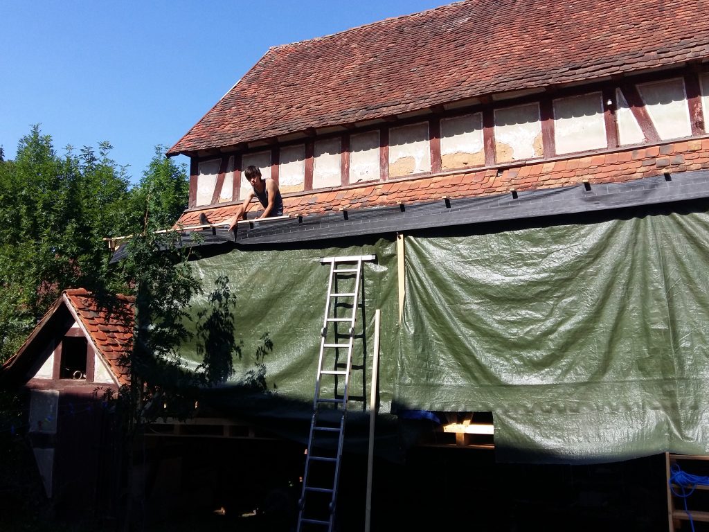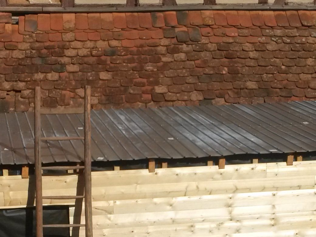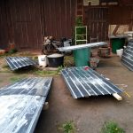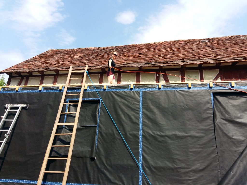 Zwar sind wir schon zuvor beim Aufbringen der Windsperre mit der Höhe, die unser Bauwerk in der Zwischenzeit erreicht hat, konfrontiert worden. So richtig bewusst geworden sind wir uns dieser – und der damit verbundenen Gefahren – aber erst beim weiteren Dachbau. Wir waren ständig darauf angewiesen, die doch sehr sperrigen, zuvor zugeschnittenen und sortierten Dachbleche an die richtige Stelle zu bugsieren, einzupassen und auf bisher nicht verschraubten Blechen sitzend wiederum danebenliegende zu verschrauben; das alles in etwa 5 Metern Höhe.