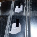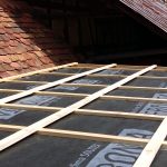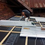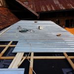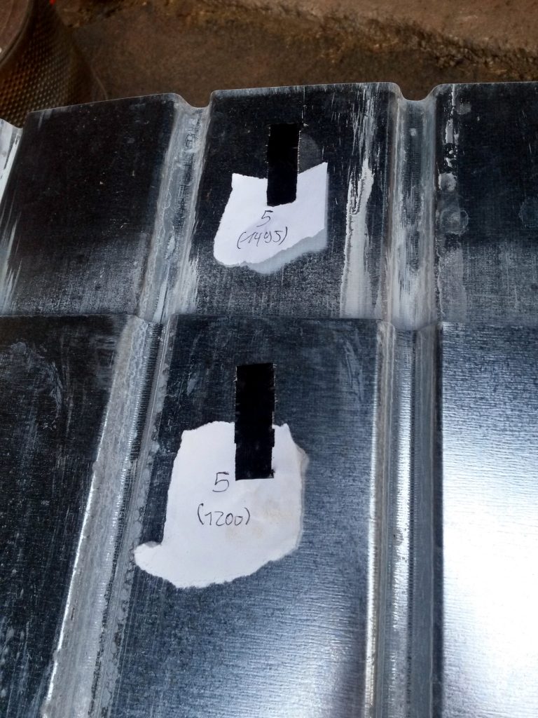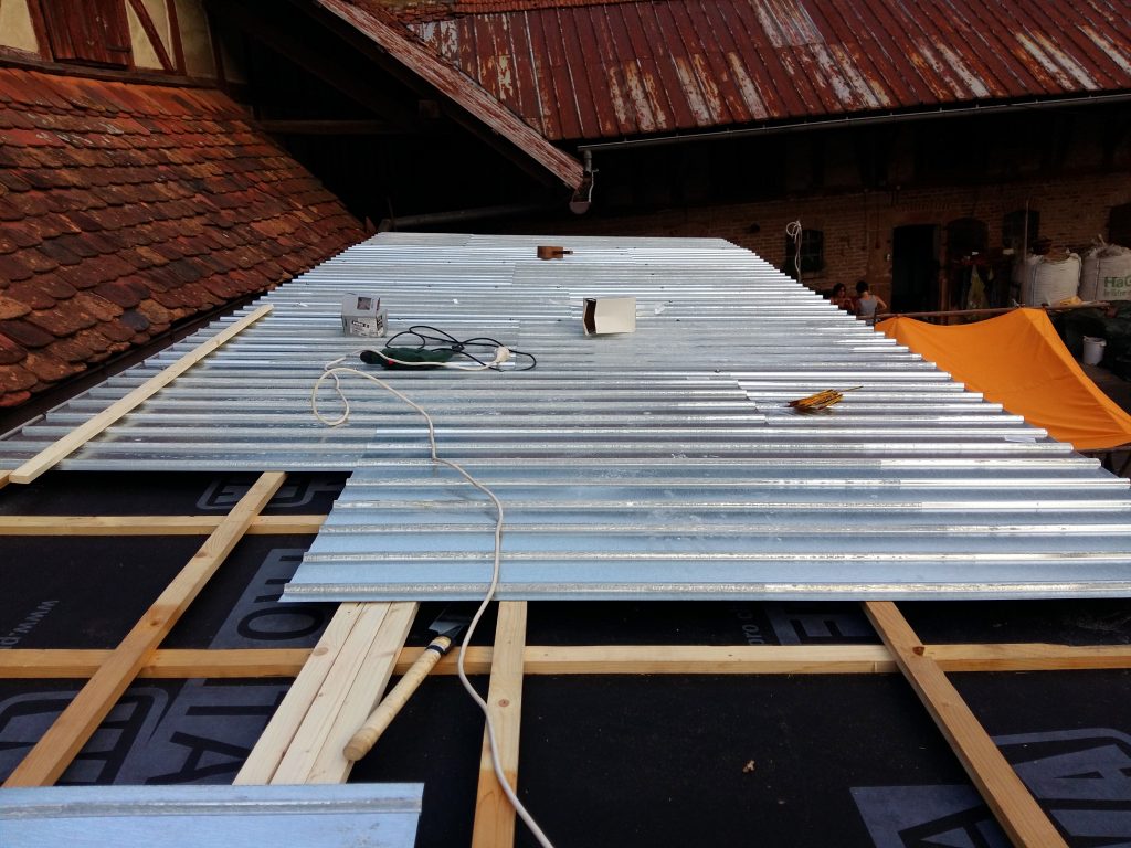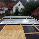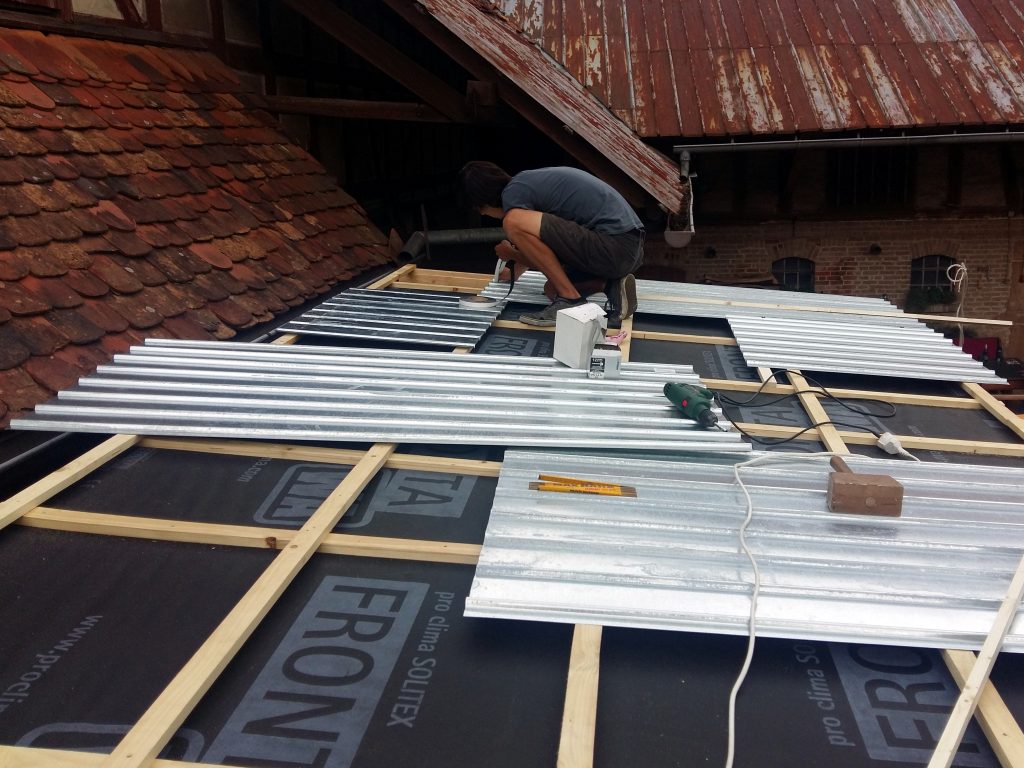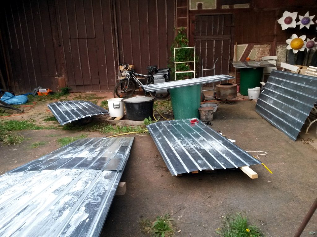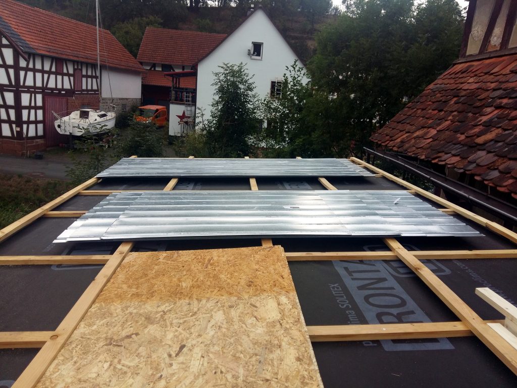 Wir haben für das Dach auf 3 mm dicke, verzinkte Stahl-Trapezbleche zurückgegriffen, die mit selbst schneidenden und einem Dichtungsring versehenen Schrauben auf der zuvor aufgebrachten Konterlattung befestigt wurden. Dabei mussten die Blechstücke mindestens 10cm überlappen und mit zwei Reihen Kompri-Klebeband verfüllt werden, damit, unserer geringen Dachneigung (5°) wegen, abfließendes Wasser davor abgehalten wird, entgegen der Neigung zwischen den Überlappungen hindurch zu kriechen (Kappilareffekt).