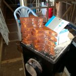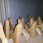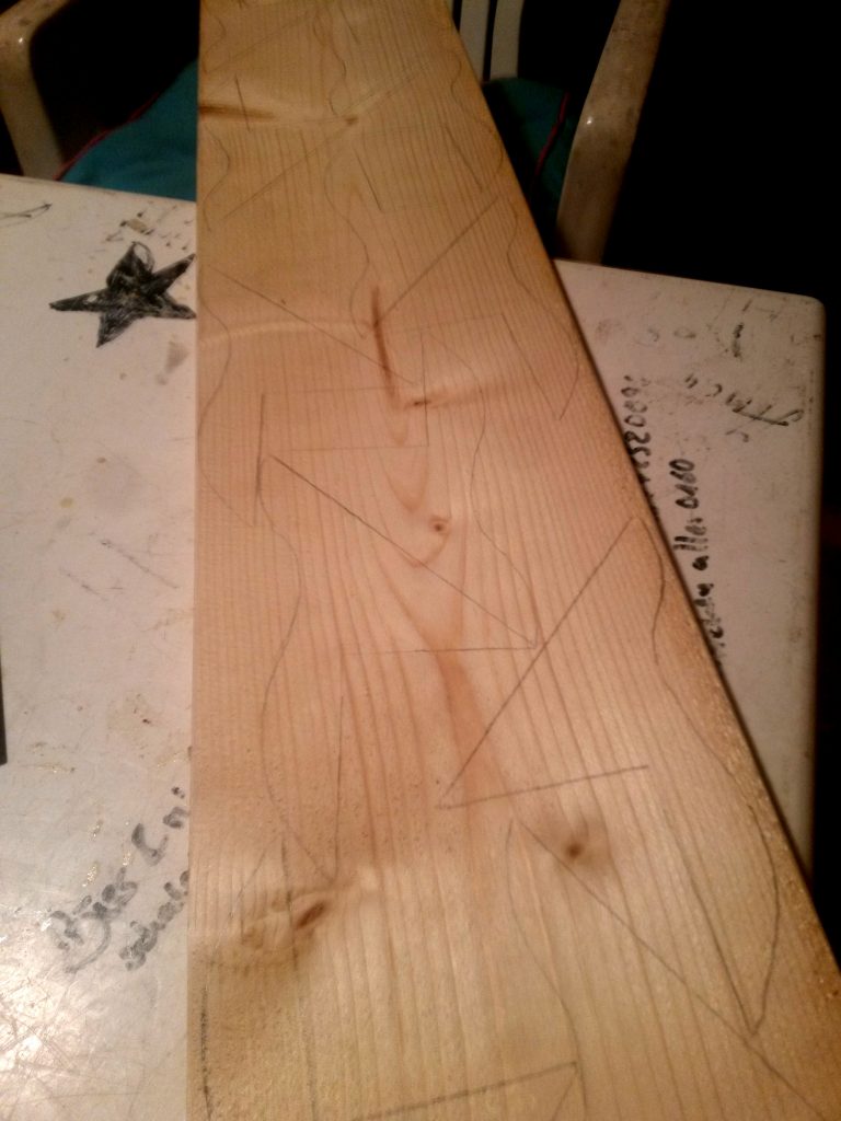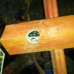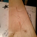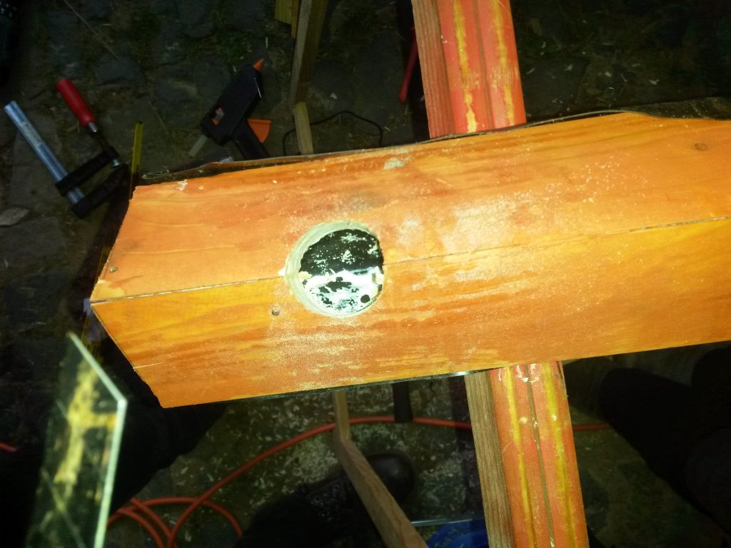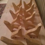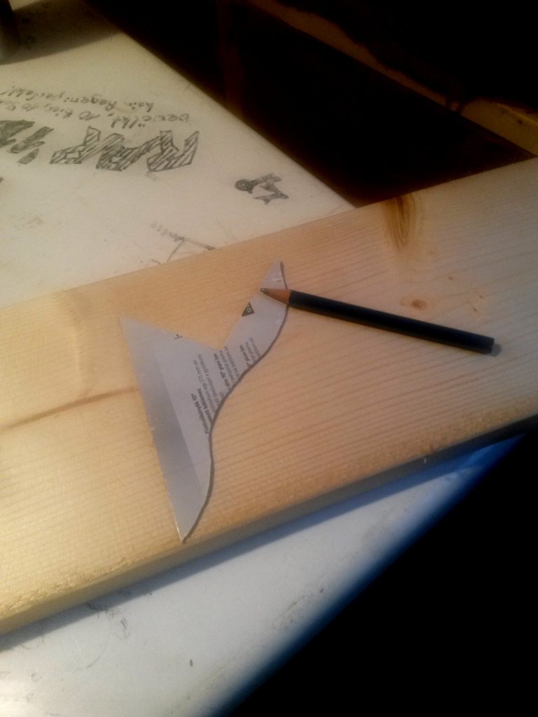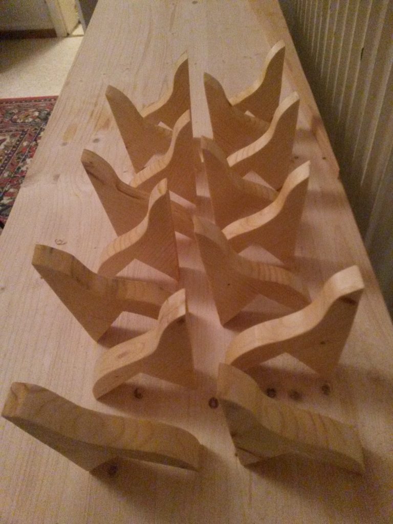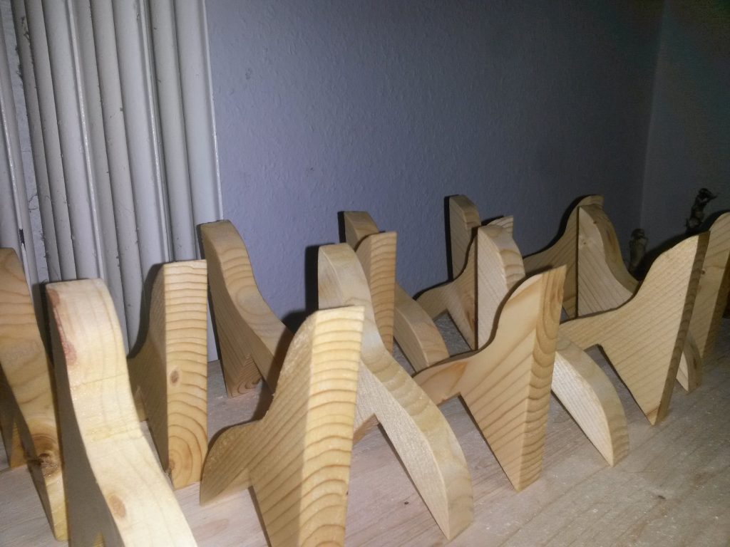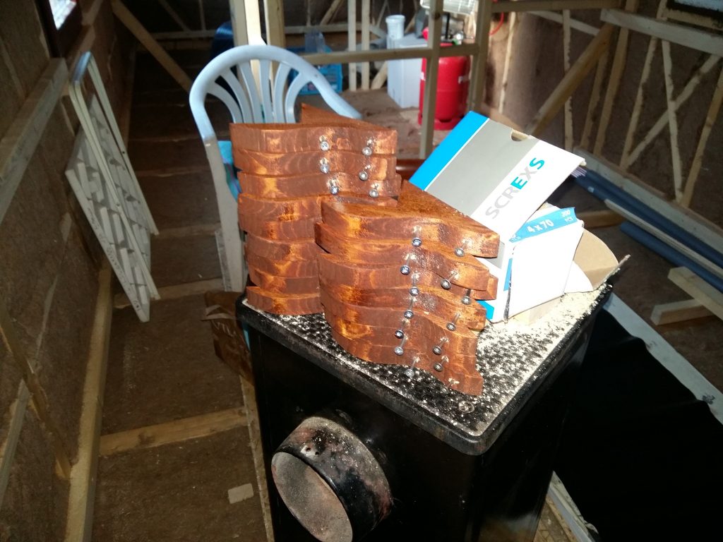 Zur Montage wurden ebenfalls aus Glattkantbrettern mehrere Halterungen mittels selbst designter Schablone ausgesägt und anschließend wie zuvor die Regenrinne selbst mit Leinöl usw. behandelt. Beim Aussägen haben wir festgestellt, dass man bei sowas unbedingt auf die Faserrichtung des Holzes achten sollte, da es sonst an den schwächsten Stellen wegbricht.
