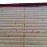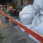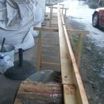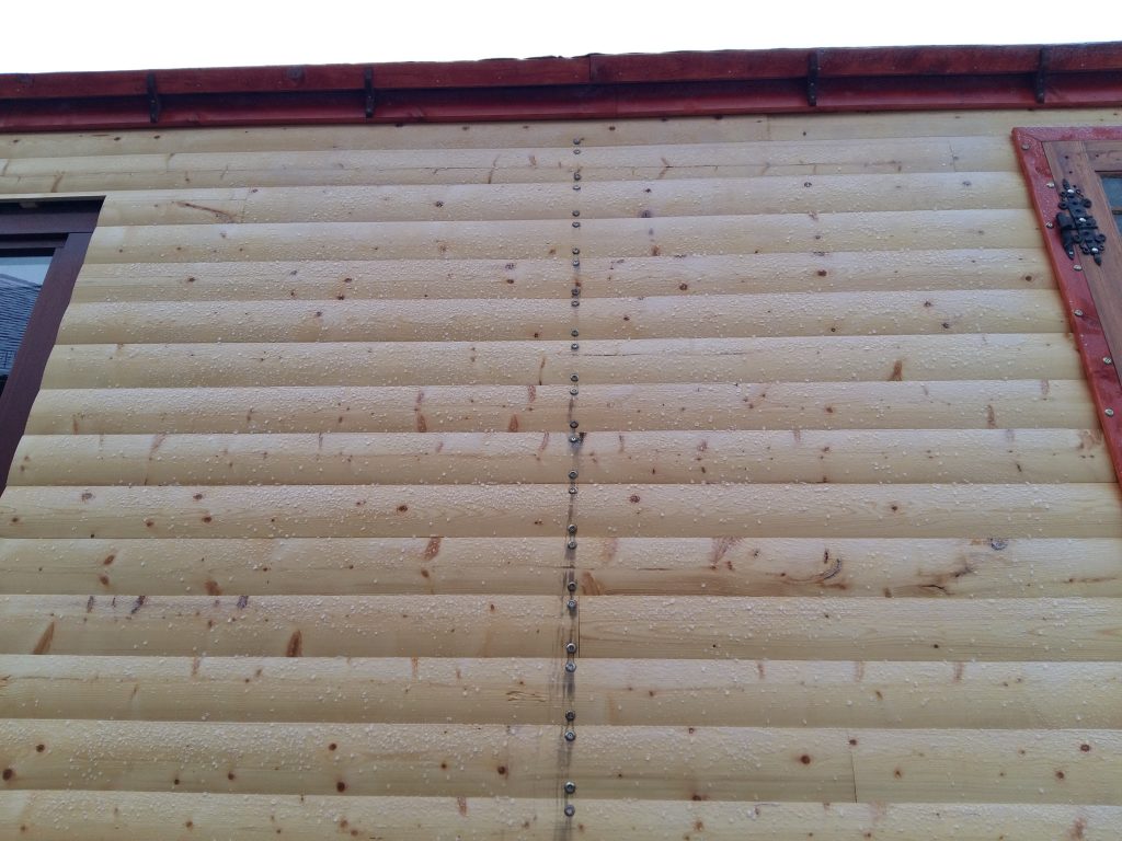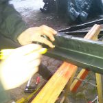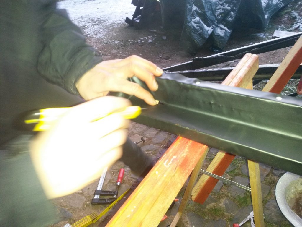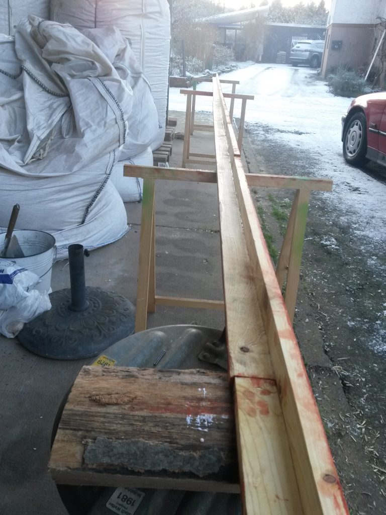 Wir nutzen die Zeit zum Bau einer Dachrinne. Diese muss unbedingt her, da das vom Dach abfließende (Schmelz..-)Wasser aufgrund des sehr geringen Dachüberstandes mehr an der Wand herunter und so auch in unseren Türausschnitt hinein fließt, als einfach abzutropfen. Außerdem wollen wir das Regenwasser nutzen können.